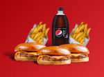Combo completo com 3 Burger Smash Little (Pão brioche, smash artesanal bovino de 50g, queijo cheddar fatiado e molho especial) + 2 batatas + 1 Refri de 1 litro.